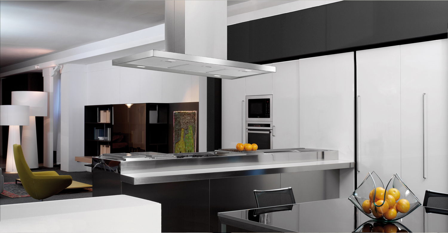Ver modelos - Campanas de isla → Ideales cuando la cocina es el centro de la vivienda. Si tienen presencia, deben ser elegantes y bien proporcionadas.