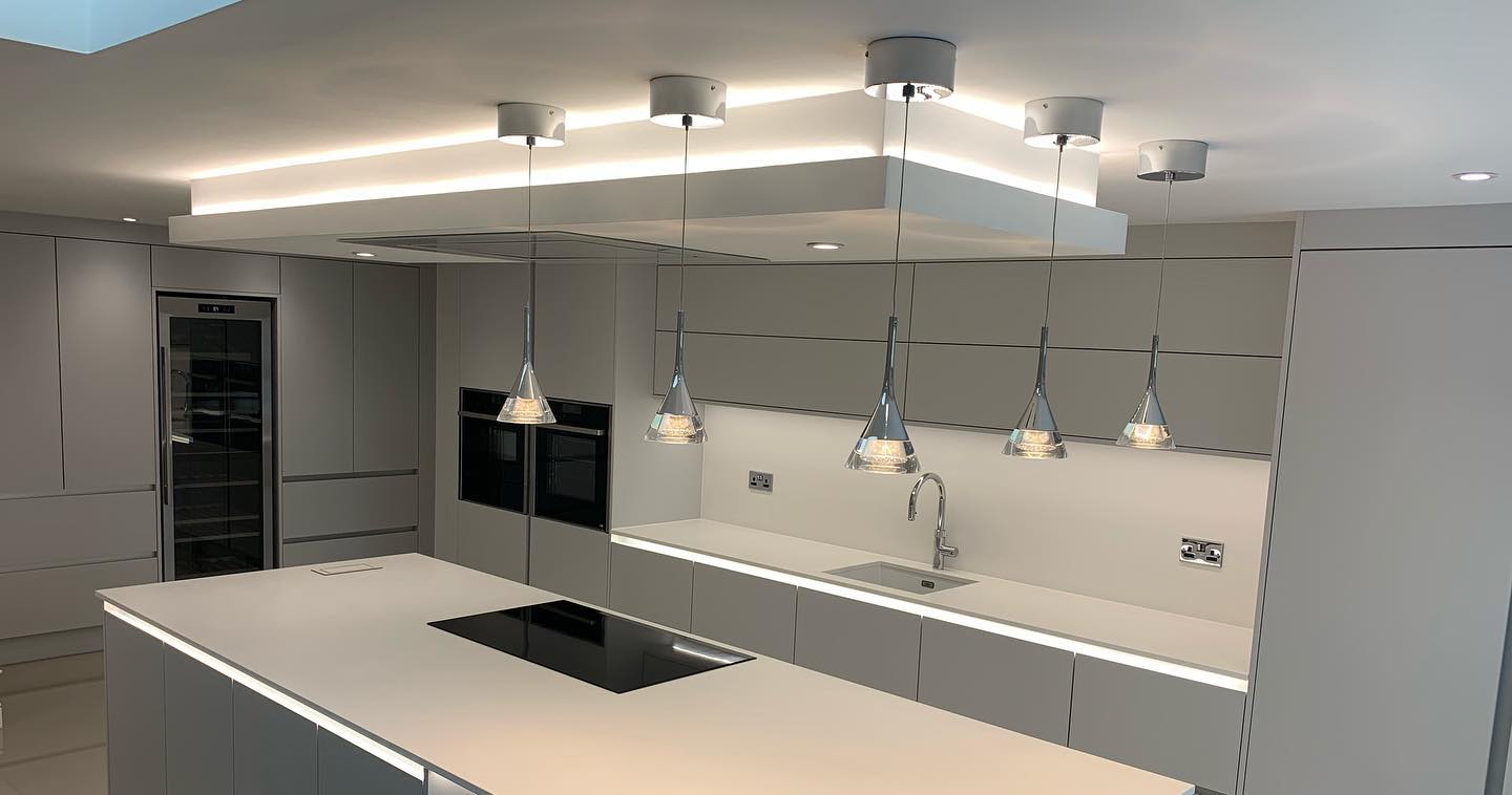 Al ser una cocina amplia y abierta, han instalado una isla generosa, dónde han instalado la placa de cocción y una pequeña office para disfrutar de un buen desayuno o simplemente una buena charla. Encima de la placa encontramos una campana de techo Cloud 360. consiguiendo un espacio más despejado