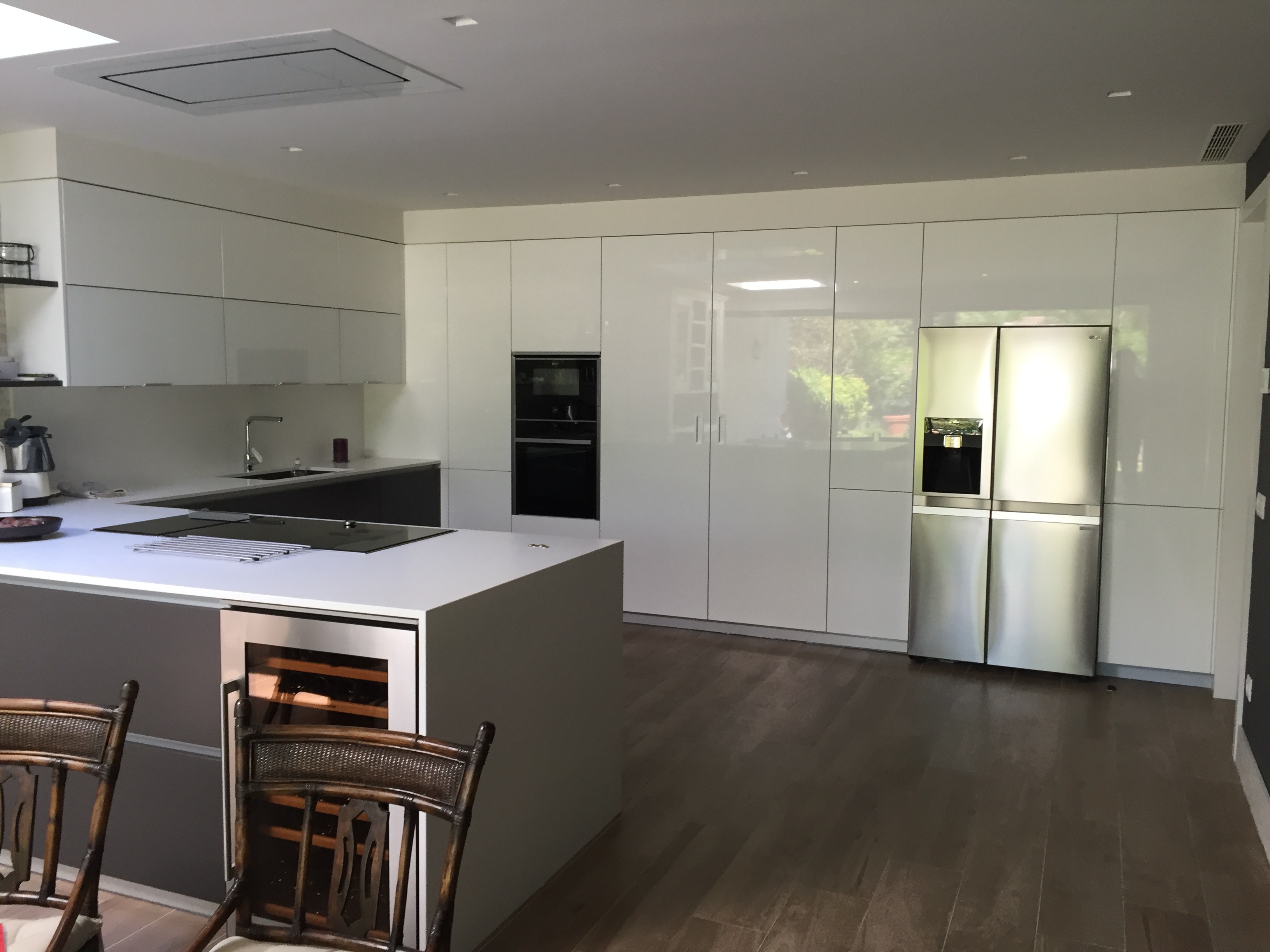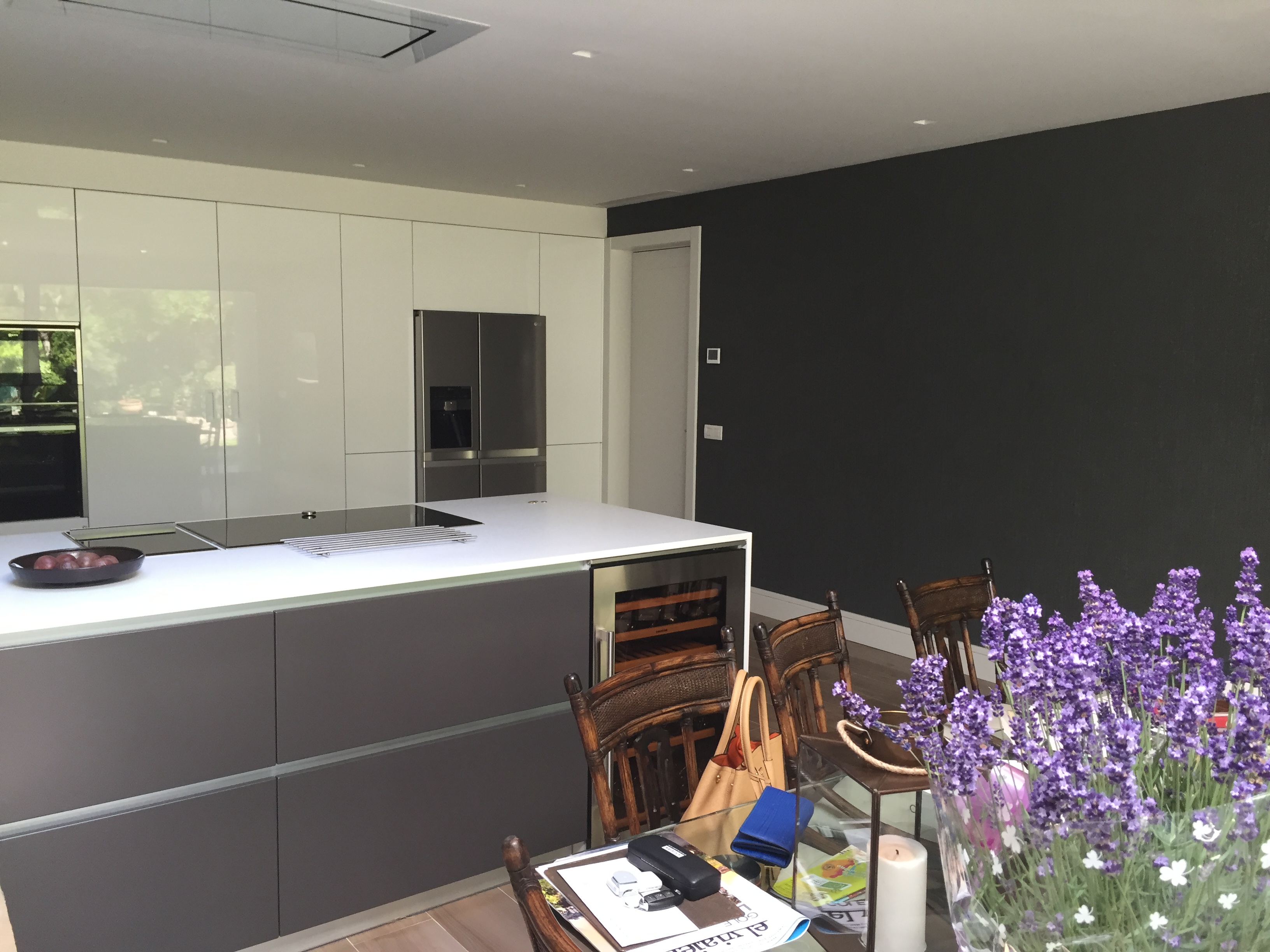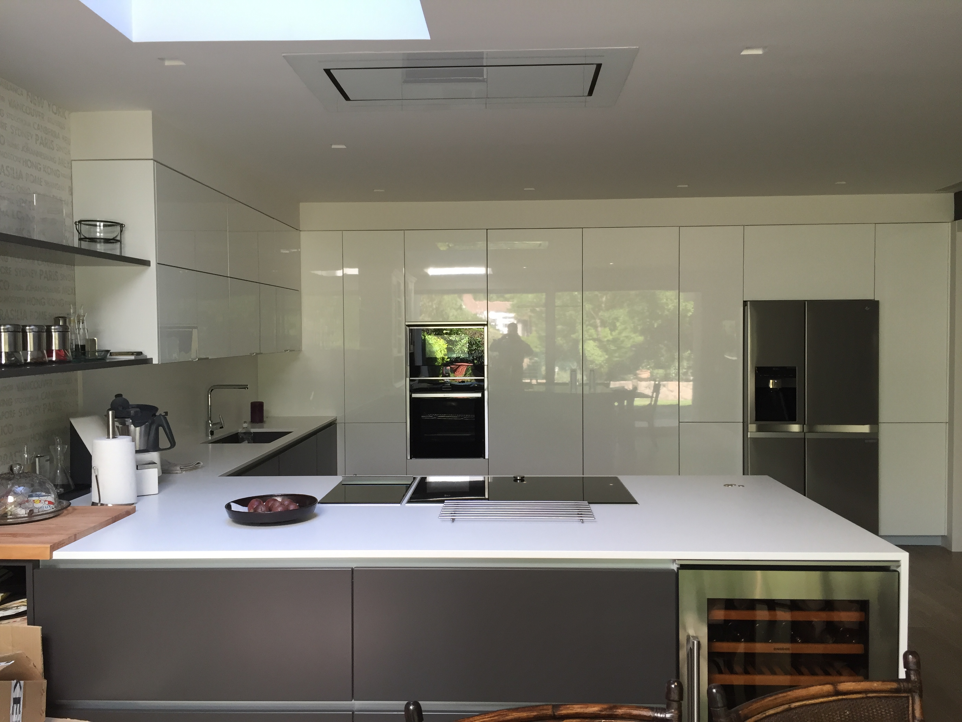 Para la organización eligieron la forma de “L” con barra americana situando a esta zona de cocción como protagonista y donde nuestra campana Cloud acaba de coronar a esta parte. Acabada en cristal blanco combina a la perfección con los muebles de VegasaKitchen en laca brillo blanco con laca seda antracita y encimera de Compaq. Una combinación simplemente perfecta.